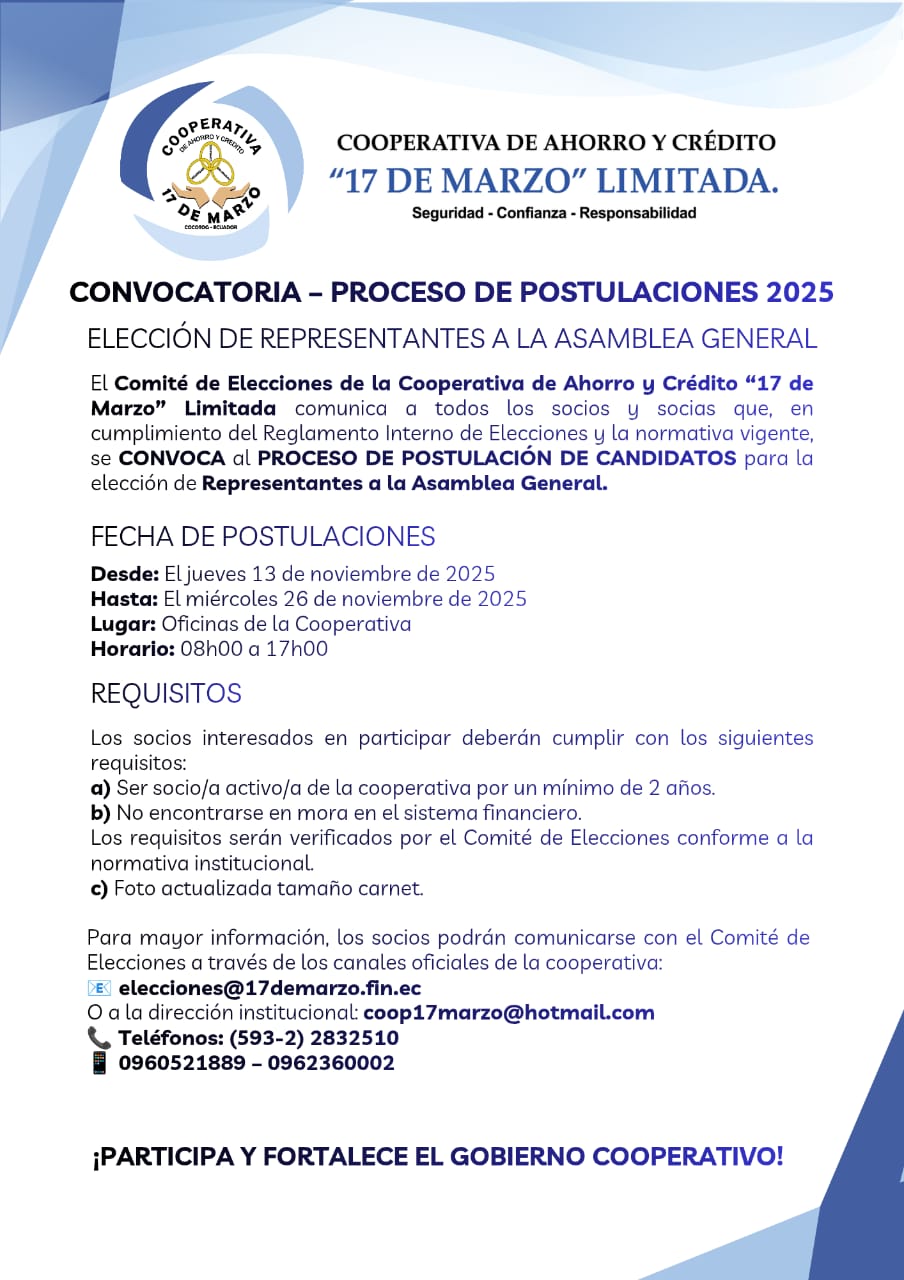 En esta sección encontrarás todas las convocatorias del Consejo de Administración, incluyendo asambleas, elecciones, programas para socios y otros eventos importantes.